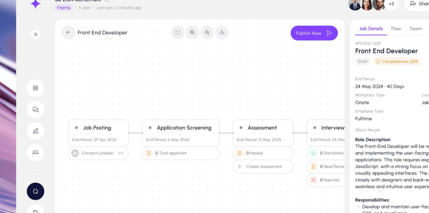 Instead of scattered tools, the dashboard centralizes key hiring actions, making it easier to compare applicants and move them through stages. Clear visual hierarchy and modular components support quick decision-making, which is critical in recruitment. The result is a system that positions AI as a practical layer for efficiency.